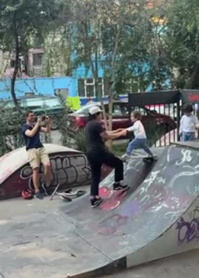 A toddler on a skateboard, assisted by an adult, rolls down a small skate ramp in what appears to be a public skate park. Another adult stands nearby, capturing the scene with a smartphone. The toddler, dressed in light-colored clothing, is positioned on the skateboard at the top of the ramp, with the adult holding their hands. The adult is wearing dark clothing and a baseball cap. As they descend, the toddler briefly loses balance, but the adult quickly steadies them. The skate park features graffiti-covered ramps and is surrounded by trees and buildings. In the background, other individuals can be seen, including one near a stroller.