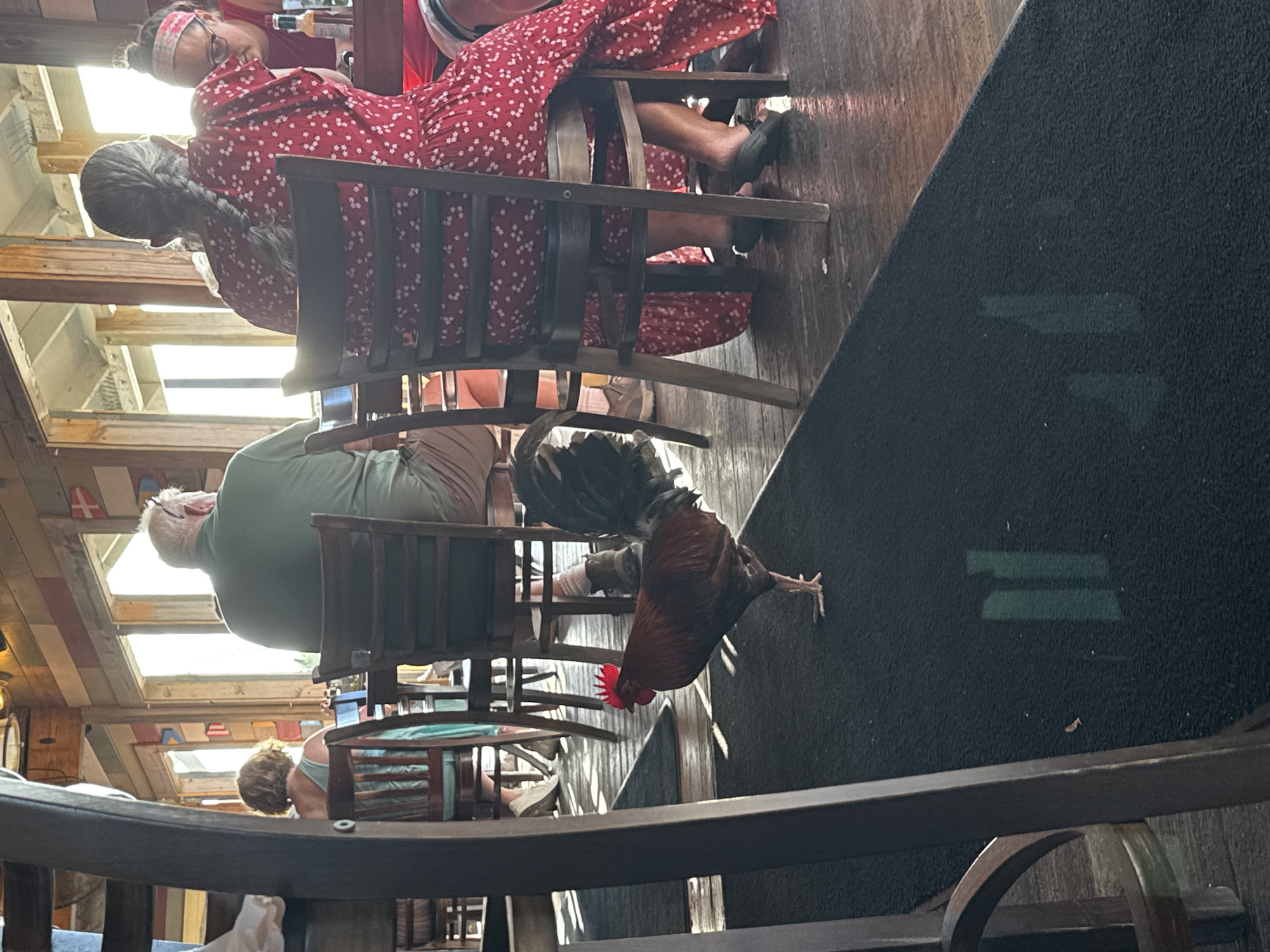 A rooster, with red comb and dark feathers, struts across a black floor near a table where several people are seated. One woman wears a red dress with white floral pattern, another a headband. A man in a green shirt sits nearby. The setting appears to be a restaurant with a wooden, nautical-themed interior. Bright light shines in through a series of windows above.