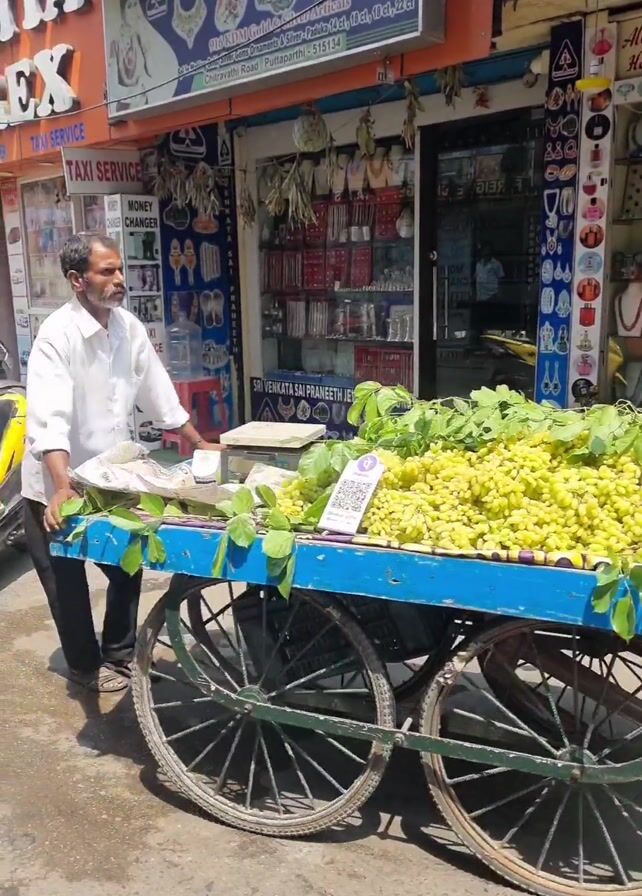 A man in a white shirt and black pants pushes a blue cart loaded with green grapes along a sidewalk. The cart has large, spoked wheels. The background features a row of small shops with various signs, including jewelry stores and a gem shop. The environment appears to be a busy street in India, judging by the store names and signage. The scene is brightly lit, indicating a sunny day.