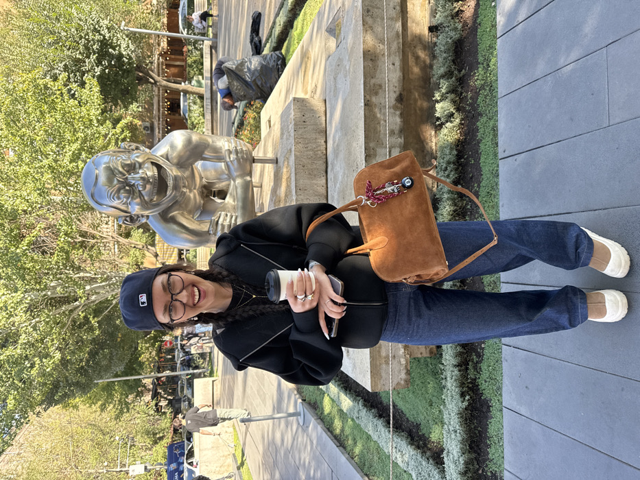 The image depicts a young adult female standing on a grey paved walkway in Yerevan, Armenia, with the "Laughing Man" (or "The Monk") statue by Zeng Fanzhi visible behind her to the right. This statue is located in the vicinity of the Cascade complex, near Tumanyan Street. The woman is positioned centrally, facing forward and smiling broadly at the camera. She wears dark-rimmed glasses, a dark blue baseball cap with a white MLB logo, and has her dark hair styled in two long braids. Her attire consists of a black full-zip hooded jacket with puffed sleeves, dark blue wide-leg jeans, and light-colored platform shoes. She holds a white disposable coffee cup with a black lid in her left hand and a dark-colored smartphone in her right hand, which rests on her left forearm. A brown suede-like shoulder bag with a long strap hangs from her right side, adorned with a red and white patterned ribbon, a silver-colored figure charm, and a black eight-ball charm. Several rings are visible on both her hands. To her right, slightly behind her, stands the large, metallic (silver-toned) sculpture of a crouching, broadly grinning figure with exaggerated facial features, resting on a multi-tiered concrete base. In the background, to the left, a paved walkway extends with a metal barrier. A man in dark clothing walks away from the camera. Further back, green trees with some autumn foliage line a street where vehicles are visible. To the right, behind the statue, a strip of green shrubs and a grassy verge are visible. A man wearing a hat and a blue shirt is bent over, collecting material into a large black trash bag on the grassy area. The scene is illuminated by bright daylight, casting subtle shadows.