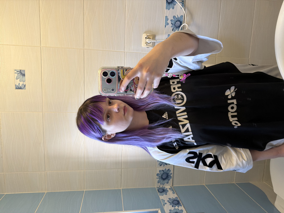 A person with vibrant purple hair and bangs takes a selfie in a bathroom. The person is wearing a black and white sports jersey, with the word "PROVINCIA" visible. The phone case is transparent and decorated with small charms. The bathroom features white and blue tiled walls and a white sink visible on the right edge. The photo is slightly rotated clockwise.