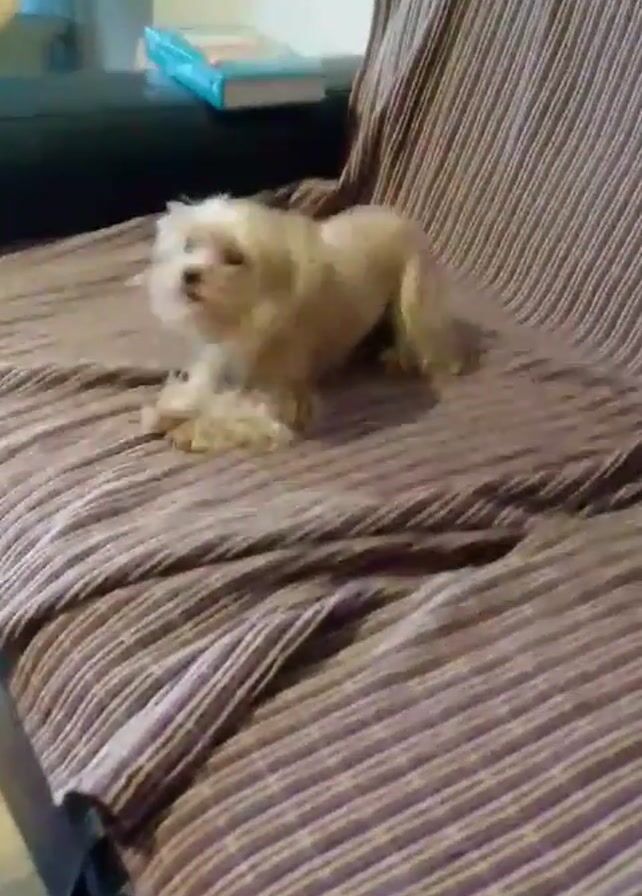 A small, light-colored dog stands on a couch covered with a striped blanket. The dog is facing the camera and panting, its mouth slightly open. Behind the couch, there's a book on a table. The camera is static, focusing on the dog on the couch.