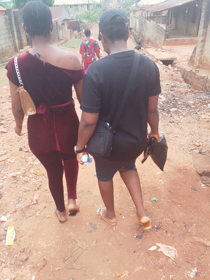 Two women walk away from the viewer on a dirt road in Nsugpe, Nigeria. The woman on the left wears a maroon, off-the-shoulder dress with leggings and carries a small purse. The woman on the right wears a black t-shirt, dark shorts, a baseball cap, and sandals, carrying a black bag across her body and a dark object in her right hand. A third woman in a floral top walks ahead. The environment consists of buildings with corrugated metal roofs and brick walls along the dirt road.