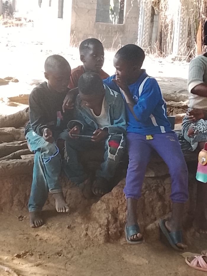 An outdoor scene in Akwanga, Nigeria, depicts five individuals. Four young males, likely children, are clustered around a smartphone held horizontally by one of them, seated on an uneven, light brown earthen/rocky surface. The child on the far left is barefoot, dressed in a dark long-sleeved shirt and light blue trousers. The child holding the phone, positioned center-front, wears a light undershirt, an open light-colored jacket, and distressed light blue jeans with a red and green patch on the left knee; he wears dark flip-flops. A third child, situated behind the central child, wears a reddish-brown t-shirt and has an arm around the central child's shoulder. A fourth child, seated to the right, wears a blue short-sleeved top, purple sweatpants, and dark flip-flops; his right arm is around the central child's shoulder, and his left hand is near his mouth. All four children direct their attention towards the smartphone. A fifth individual, partially visible on the far right, is seated, wearing a striped top and patterned lower garment, holding a small, multi-colored bag. The background consists of light-colored concrete block structures and sparse, dry vegetation, illuminated by bright daylight.