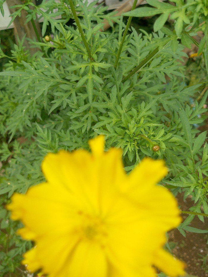An outdoor scene in Ciherang, Indonesia, is depicted, focusing on plant life. The foreground is occupied by a large, unfocused yellow flower, its petals and central structure blurred, extending from the bottom and lower-right edges of the frame. Behind this, a green plant with sharp, finely dissected leaves and multiple stems fills the midground and background. A small, spherical, light-brown flower bud is visible among the green foliage in the upper-right quadrant. Dark earth is discernible at the base of the plant structures, and a light-colored, vertical element, possibly a stake or barrier, is present in the upper-left background. No human subjects or discernible actions are present.