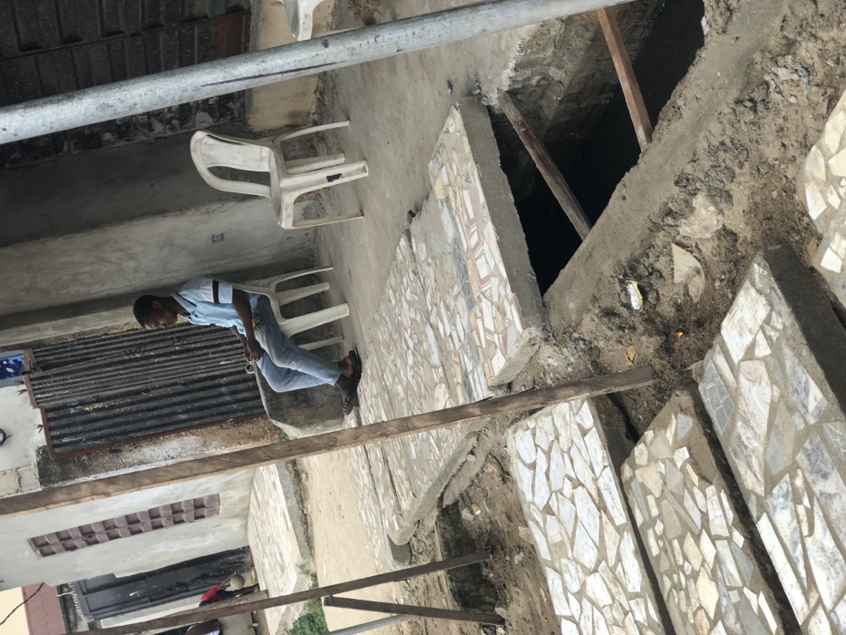 A man in a light blue shirt and jeans sits on a white plastic chair outside, near a corrugated metal structure and tiled surfaces. Beside him is an open, dark hole supported by wooden beams. Additional white plastic chairs stand nearby. The ground is a mix of concrete and partially tiled surfaces. A wooden beam lies across the foreground.