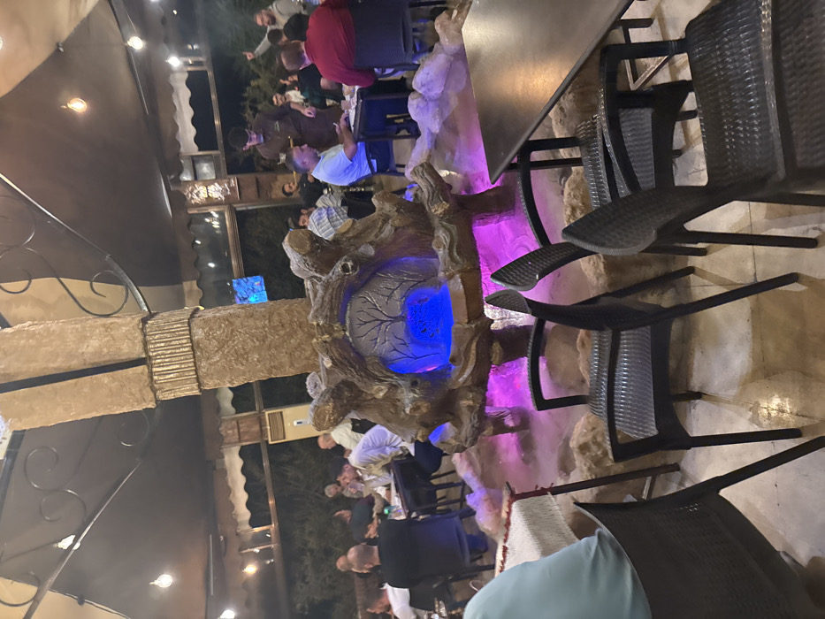 This image depicts an outdoor or semi-outdoor restaurant/cafe setting at night, located in Barza Municipality, Syria. The scene is dominated by a central, multi-tiered decorative water feature constructed from light brown, textured material resembling stone or wood. This feature includes a tall central column and a sculpted base with organic, branch-like formations. An internal cavity within the base emits a blue light, illuminating a silhouetted tree design. The base of the feature also displays purple illumination, and a low-lying, hazy fog emanates from its perimeter, spreading across the tiled ground. Approximately 15 to 20 adult males are visible, seated at various tables throughout the establishment. They are dressed in casual to smart-casual attire. On the right side of the image, a server in a brown uniform is observed holding a tray near a table occupied by several men, one of whom is wearing a light blue shirt. Further to the right, another male figure with his hand raised is partially visible. The area is covered by a dark overhead canopy from which several pendant lights hang, providing ambient illumination. Additional dark-colored, woven-patterned chairs are arranged in the foreground, facing away from the viewer, near a dark-topped table. Another table covered with a white tablecloth is partially visible on the left. A hookah pipe is discernible near one of the tables to the left of the central water feature. The background beyond the covered area is dark, with minimal visible details.