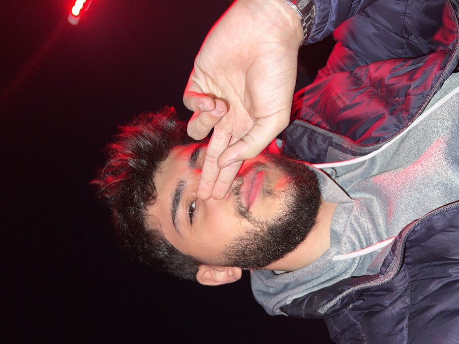 A man is seen in a low-light environment with red light illuminating parts of his face and jacket. He has dark hair, a beard, and is wearing a grey hoodie under a dark-colored puffer jacket. He is holding his hand up to his face in a specific gesture, with his fingers close to his eye. A watch is visible on his wrist. The background is primarily dark.