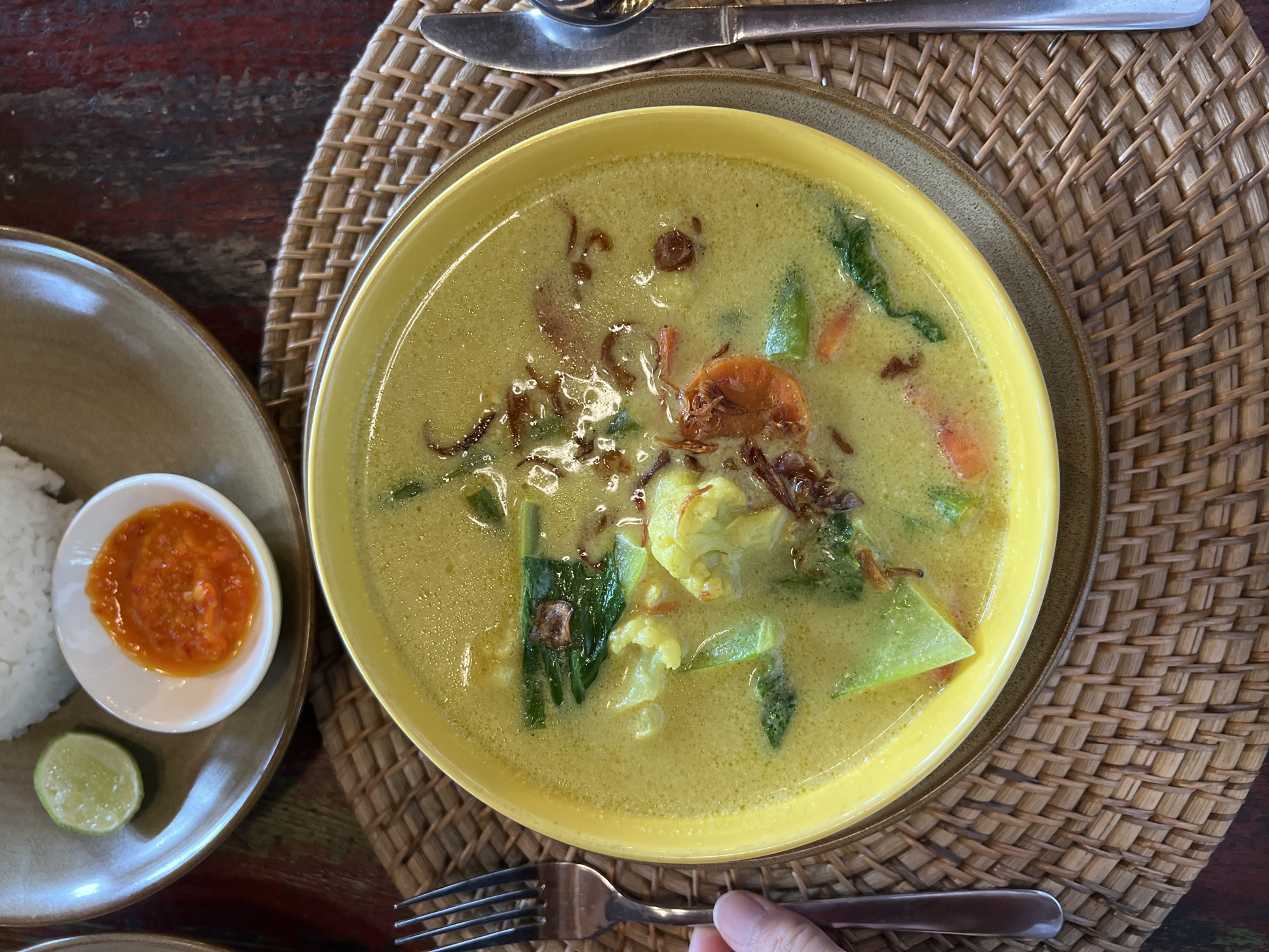 A high-angle shot shows a yellow bowl of sayur lodeh, an Indonesian vegetable stew in coconut milk, placed on a woven placemat atop a dark wooden table. To the left, a separate plate contains white rice, a small dish of bright orange sambal, and a lime wedge. Silverware, including a knife and spoon, are positioned near the top of the frame, while a fork is held by a hand at the bottom. The dish appears to be in the city of Unknown, Indonesia.