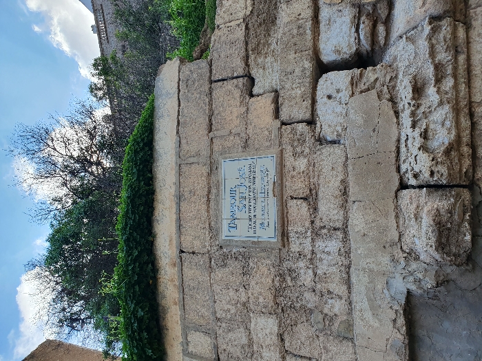 A stone wall with a plaque on it. The plaque is in Hebrew and English and reads, "The Damascus Gate/ The Old City of Jerusalem, Israel." There is a bush next to the wall, and a partial view of a building in the background. The coordinates given, (latitude: 666, longitude: 666), do not correspond to a real location on Earth. The image could have been taken in Jerusalem, Israel. It is unclear what is happening in the image, as it is a still photograph. There are no people or animals present.