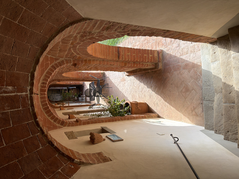 The image depicts an architectural passage or courtyard within a building in Montepulciano, Italy. The vantage point is from the top of a descending flight of rough-hewn stone stairs, with a black metal handrail affixed to the light-colored wall on the left. The stairs lead down to a brick-paved ground, laid in a herringbone pattern. On the left side of the passage, a light beige wall features decorative elements including two terracotta wall planters, one of which contains a small plant, and a rectangular plaque mounted beneath the upper planter. Further along this wall, a large, ornate terracotta pot holds a bushy green plant. To the right, a series of red brick arches and supporting pillars define a covered walkway. Strong, natural sunlight illuminates the scene from the upper right, casting long, distinct shadows across the brick ground and along the walls, highlighting the architectural textures. In the mid-distance on the left, an outdoor seating area is visible, comprising a round, dark metal mesh table and at least two matching chairs. Beyond the brick arches on the far right, a section of green grass is discernible, suggesting an adjacent open garden area. No individuals or animals are present in the scene. The overall environment is a well-maintained, traditional Italian architectural space.