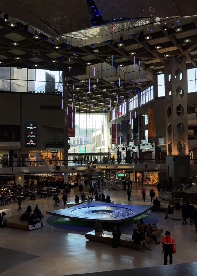 large indoor public space, possibly a mall or convention center, with multiple levels and a high ceiling. In the center of the ground level is a square, shallow water feature with a dark blue bottom. People are walking around and sitting on benches surrounding the water feature. There are shops and food vendors visible on the upper levels. A person wearing an orange safety vest and black pants walks across the bottom right corner of the frame. Above, there are suspended vertical light fixtures, as well as architectural lighting embedded in the ceiling.
