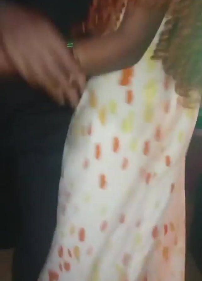 A woman with orange and brown dreadlocks is dancing with a man. The woman is wearing a white dress with orange and yellow splotches, and a bracelet on her left wrist. The man is wearing black clothes. The video is filmed close up, and the background is dark. There is music playing. The woman touches the man's hand while dancing.