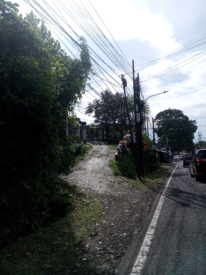 The image captures a daytime scene in the city of Domphoog_Dungkarchhoeling, Bhutan, under a partly cloudy sky. The left side of the frame is dominated by a dense, dark green mass of foliage, ascending from the lower left. An unpaved or gravel path, light gray in color and marked with scattered debris, originates from the lower-center and curves upwards towards a dark metal gate flanked by two light-colored masonry pillars, positioned in the middle ground. To the right of the ascending path, a cluster of dark utility poles stands vertically, supporting numerous black electrical or communication wires that crisscross extensively across the sky. A modern-style streetlamp extends from one of these poles, pointing right. Below the poles, a yellow diamond-shaped road sign with a black downward-right arrow is visible. The right side of the image features a two-lane asphalt road with a continuous white solid line marking its right edge, receding into the distance. A line of vehicles is present on this road, with the closest being a dark-colored SUV or similar vehicle partially visible in the mid-right. Further vehicles are less distinct, indicating active traffic. Sparse grass and vegetation are present along the road shoulders and the ascending path. A collection of colorful, possibly textile, refuse is accumulated near the base of the utility poles on the right side of the ascending path. No individuals are discernible within the frame.