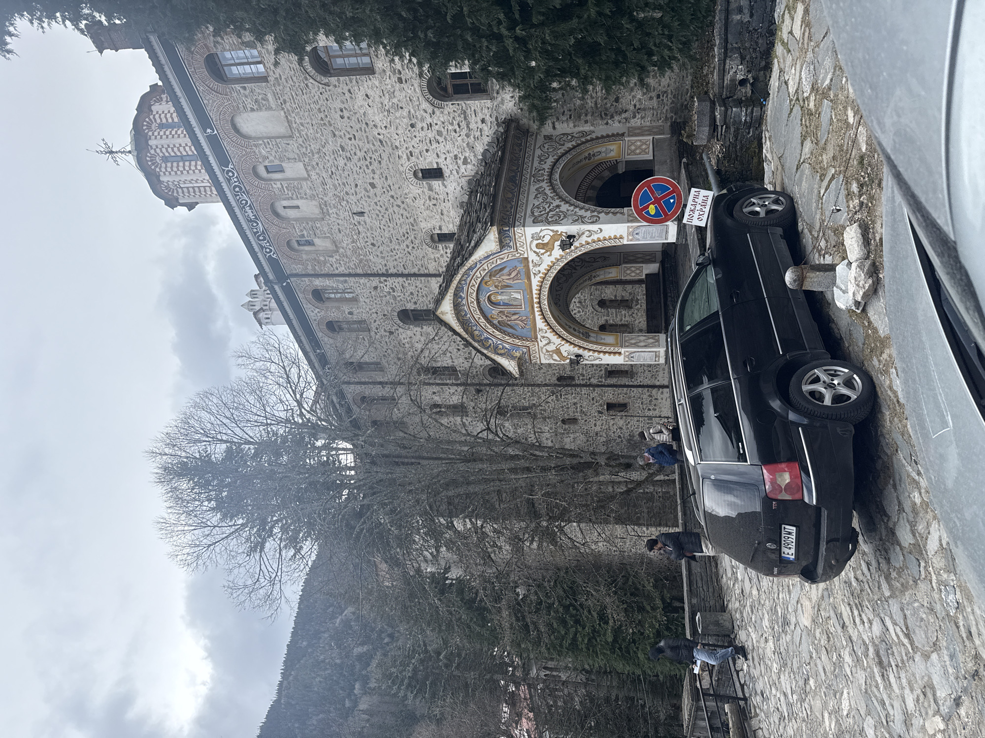 An outdoor, eye-level photograph depicts the facade of the Rila Monastery in Rilski manastir, Bulgaria, under an overcast sky. The prominent subject is a large stone building with a multi-story, grey-stone exterior featuring numerous arched windows and decorative brickwork patterns. A domed tower with a cross on its apex rises above the main structure on the right. A central entrance archway, richly decorated with vibrant religious frescoes depicting angels and figures, is located on the lower level. A dark, slate-shingled roof covers this entrance. In the foreground, a black Volkswagen Passat station wagon with Bulgarian license plate E 4909 MT is parked on a cobbled stone surface, oriented slightly towards the left. Adjacent to its front right wheel, a circular red and blue "no stopping/parking" sign is erected, with a white rectangular sign below it displaying the Cyrillic text "ПОЖАРНА ОХРАНА" (FIRE PROTECTION). Small stone bollards connected by a chain are visible near the car's front left. Several individuals are present on a cobbled path to the left of the parked vehicle. Two individuals, one in a dark hooded jacket and jeans, are positioned near a stone wall with a metal railing. Further back, three more individuals, including one in a blue jacket, are standing near the monastery wall, appearing to observe the surroundings. The environment includes several trees; a large deciduous tree with bare branches stands prominently in the mid-ground, while coniferous trees are visible on the far left, bordering the monastery structure, and to the right. A mountain range, partially covered with coniferous trees, forms the backdrop beneath a grey, cloudy sky. The ground throughout the visible area is paved with irregular grey cobblestones.