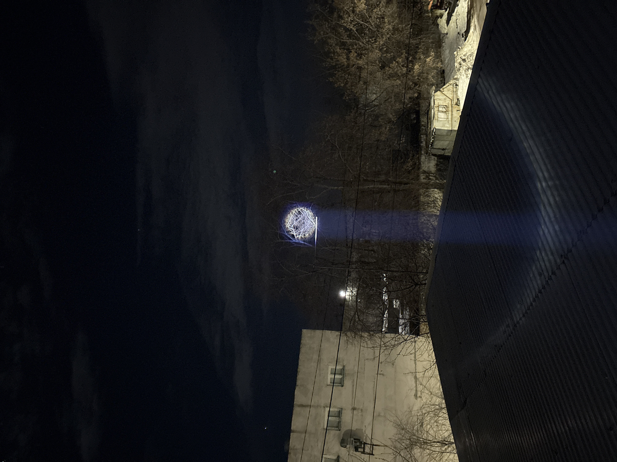 An overhead, nighttime view in Ulyanovsk, Russia, captures an urban scene dominated by an illuminated spherical light installation. The foreground features a dark, corrugated metal roof, angled upwards from left to right, displaying parallel ridges. A concentrated vertical beam of blue light emanates downwards from the main light installation, partially illuminating this roof. In the midground, to the left, stands a weathered, light-colored multi-story building with multiple rectangular windows and an external conduit structure. Bare deciduous trees with intricate branch patterns are visible between this building and the central feature. Overhead utility lines traverse horizontally across the scene. The primary subject, centrally located in the midground, is a bright, spherical light installation suspended amidst or above a cluster of bare trees. This sphere appears to be composed of numerous interconnected light elements forming a globe-like structure and emits a strong blue-white light. A distinct, focused blue light beam projects vertically downwards from this sphere. To the right, beyond the trees, patches of snow cover the ground, indicating cold weather conditions. A small, dilapidated, light-colored structure or shack is visible towards the far right, partially surrounded by snowdrifts. The background consists of a dark night sky with visible, albeit faint, cloud cover. No individuals are visible in the scene.