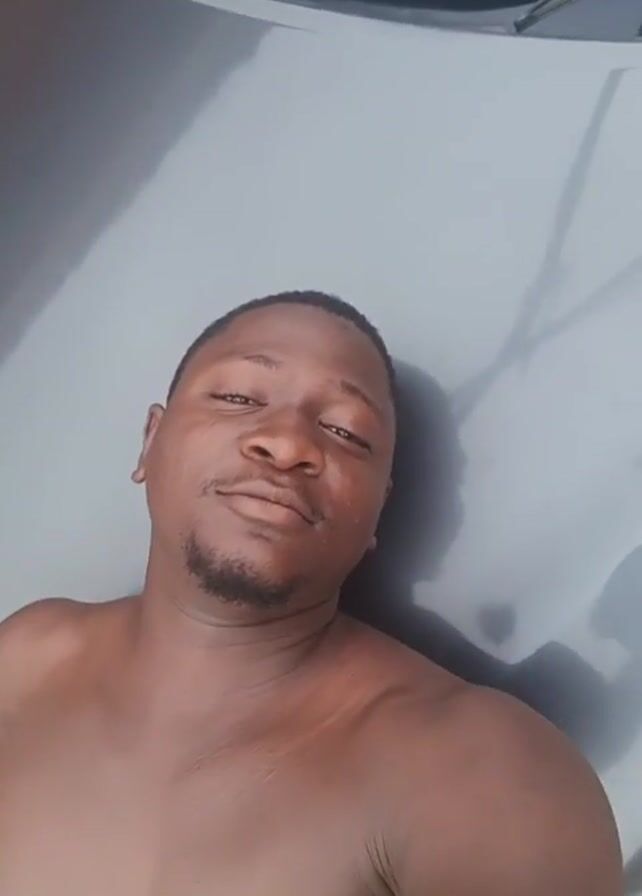 A bare-chested man lies on the hood of a gray car, looking at the camera. As the camera angle shifts, he is now standing in front of the car. The background reveals houses and power lines, suggesting an outdoor, possibly residential setting. He smiles slightly as he looks directly at the camera.