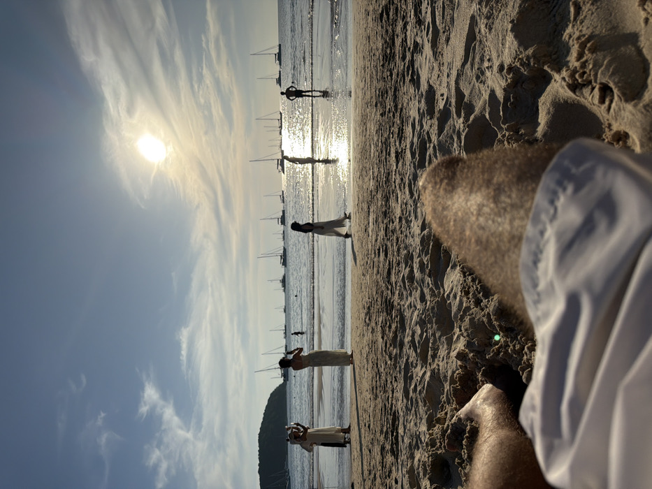 The image depicts a beach scene in Rawai, Thailand, observed from a low perspective on the sand. In the immediate foreground, a person's bare legs are visible, extended onto the light brown sand; one leg is in focus and covered with light brown hair, while the other is partially obscured by white fabric, likely shorts. The sand is textured with minor undulations and indentations. In the midground, along the waterline, several individuals are present, largely silhouetted against the bright background. From left to right: * Two figures, appearing to be adult females in light-colored long garments, stand on the wet sand. The leftmost figure holds a device, possibly a phone, to take a picture. The adjacent figure also holds a device to take a picture, facing the water. * A third figure, dressed in a light-colored long garment, walks from right to left along the water's edge, casting a reflection. * Further right, an adult male stands in the shallow water, facing the sun, with his hands on his hips. He is bare-chested. * A smaller, more distant figure is visible in the water between the left and right groups. The background features a body of water extending to the horizon, dotted with numerous sailboats and catamarans moored or anchored. A vegetated landmass, possibly an island or peninsula, is visible on the far left. The sky is light blue with scattered cirrus clouds. The sun is a bright, circular disc positioned slightly right of center, low in the sky, reflecting intensely on the water's surface.