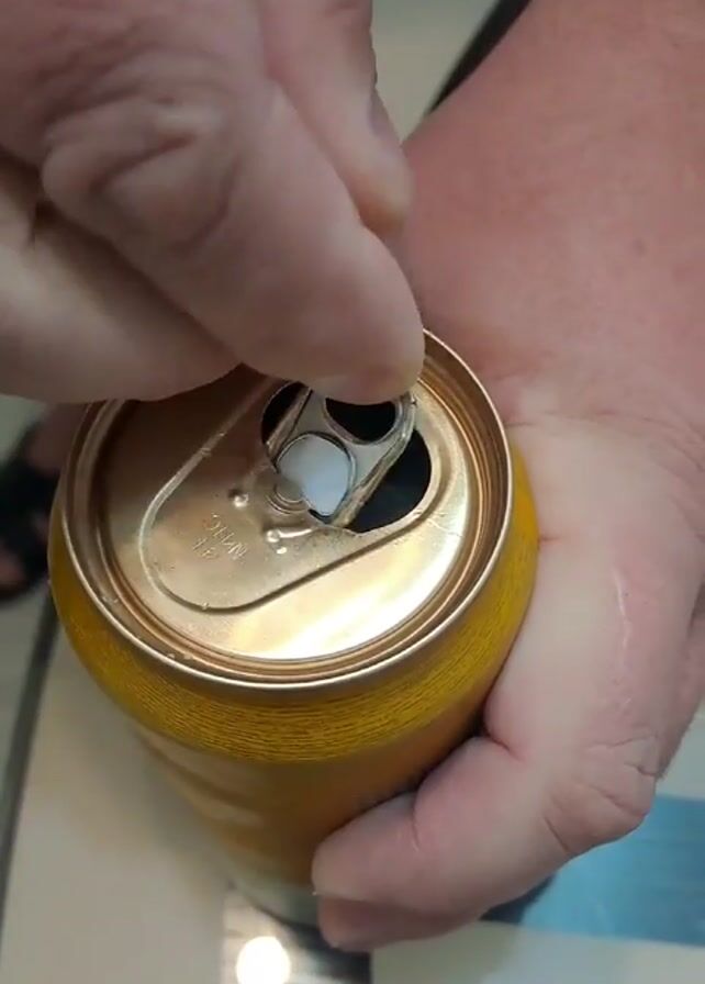 Here is a detailed description of the video: A person wearing a bathrobe and black sandals opens a yellow can of sparkling water on a table. The can’s top is gold with a silver pull tab. A QR code is revealed when the can is opened. The table is white with a gray and black design in the center. The person is holding the can with both hands.
