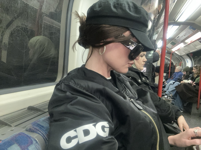 The image depicts the interior of a London Underground train carriage in Greater London, United Kingdom. In the foreground, a person is seated in profile, looking downward. This individual wears a black peaked cap, dark rectangular sunglasses, and large silver hoop earrings. Their dark hair is styled in a bun. They are dressed in a black bomber jacket featuring a prominent white "CDG" logo on the left sleeve. Multiple rings adorn the fingers of their left hand, which rests on their lap, partially obscured by a blue and purple plaid patterned seat. In the reflection of the window to the left, another passenger, wearing a light-colored head covering, is visible. Further into the carriage, several other passengers are seated along the length of the train, with red vertical support poles prominent in the background. The train interior features white walls, a white ceiling, and overhead strip lighting.