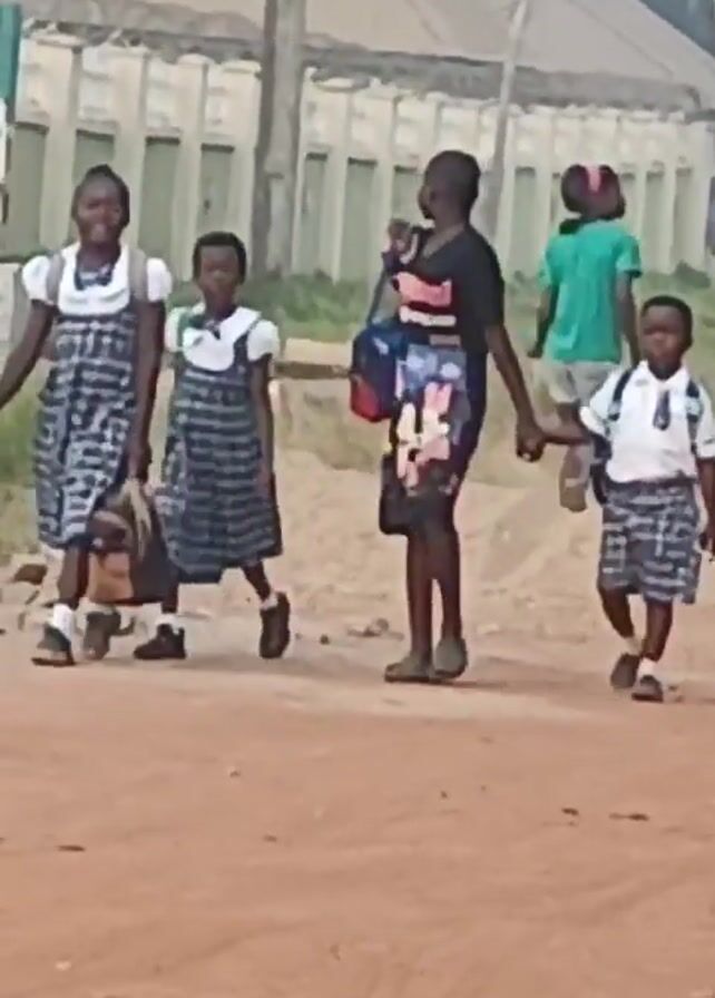 Several children are walking on a dirt road. Two girls wearing matching blue and white plaid dresses with white collars and cuffs walk together. A taller girl in a black t-shirt and printed dress leads a small child wearing a school uniform, holding his hand. A girl in a green t-shirt and light-colored shorts walks behind them. Further down the road, a person in a yellow top is visible. The background includes buildings and vegetation, and the sky appears overcast.