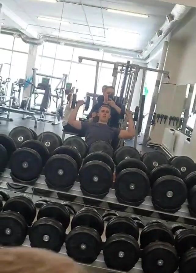 man lifting dumbbells overhead in a gym while sitting on a bench. Another person stands behind him, taking a photo or video with a smartphone. A wall of dumbbells is visible in the foreground. The gym appears to have other equipment, including weight machines, and is well-lit with large windows.