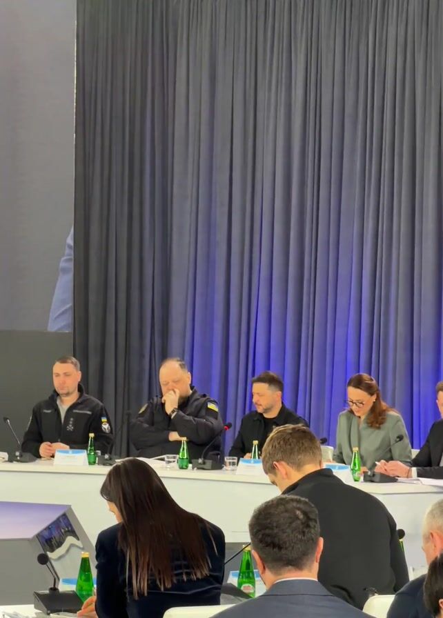 panel of six people sitting at a table in front of a blue curtain. There is a crowd of people sitting at tables facing the panel. The video focuses on two of the people on the panel, both men, one of whom is Volodymyr Zelenskyy, the President of Ukraine. Zelenskyy is speaking and gesturing with his hands. The other man has his hand to his face. There are bottles of water and glasses on the table in front of the panel.