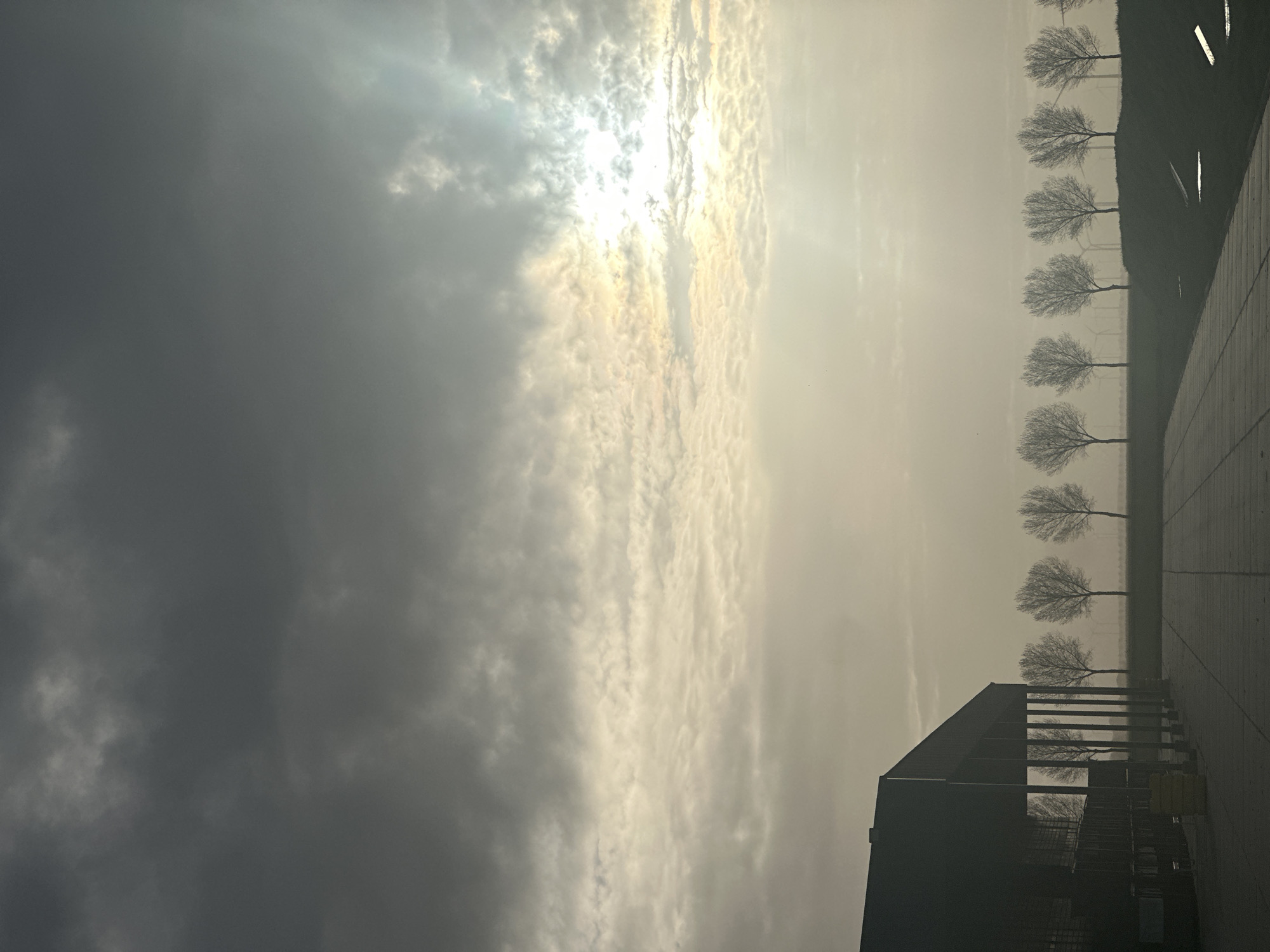 low-angle view of an outdoor scene in Lelystad, Netherlands, likely during a foggy or overcast morning. The sky is dominated by dark gray clouds on the left side, transitioning into lighter, textured clouds with visible sun rays piercing through in the center. A row of bare trees lines the horizon, fading into the mist. A dark building with a visible structural frame and railings occupies the lower right corner. The ground surface appears to be paved, and some reflected light is visible on the wet surface.