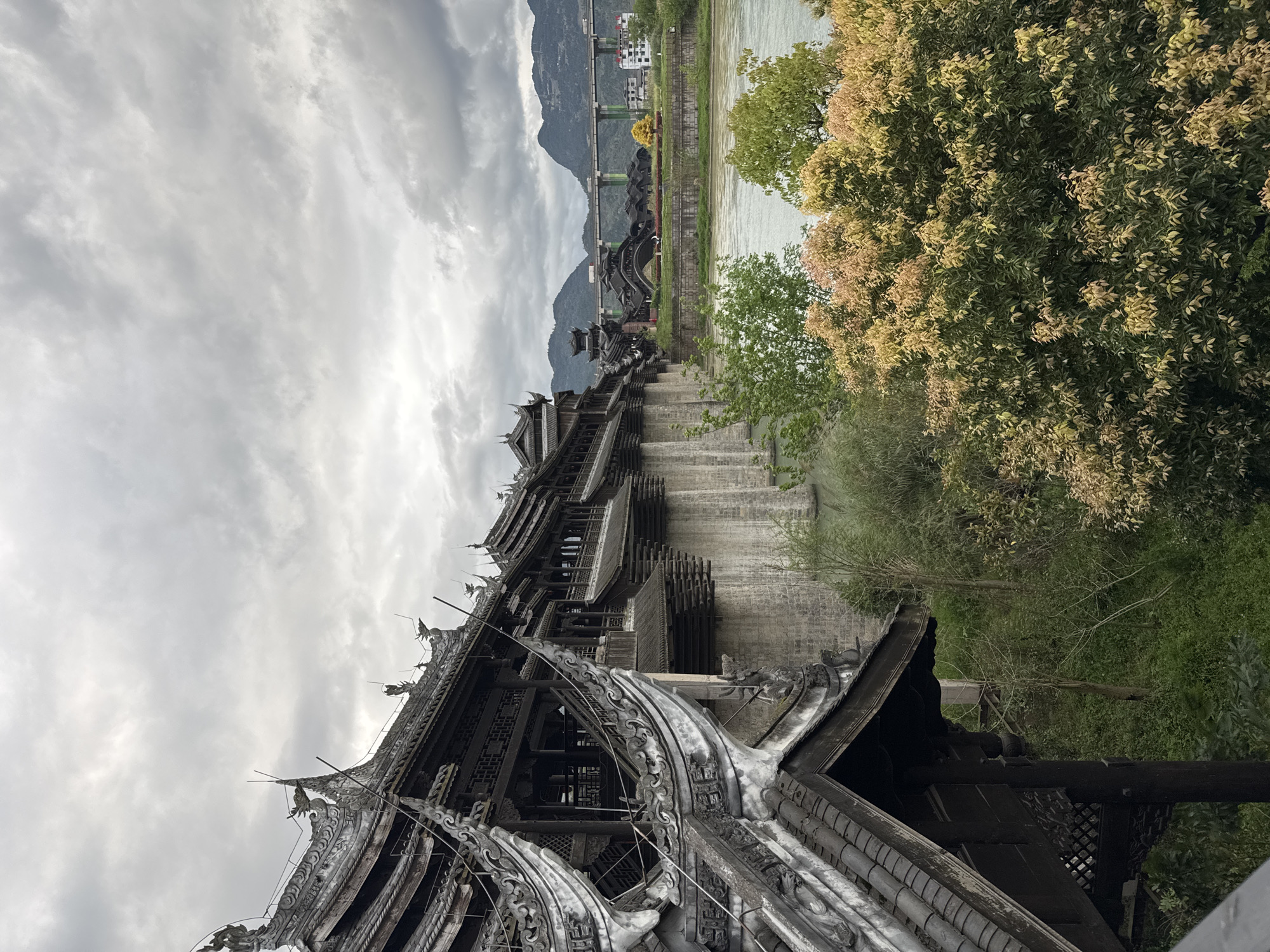 This image depicts a historic, multi-tiered, covered bridge in the city of Zhuoshui, China. The bridge features intricate dark wooden details and tile roofing. The bridge is built over a body of water, visible to the right of the bridge and in the background. A modern bridge is visible in the distant background, as well as mountains and overcast skies. Trees and vegetation are to the right. The image is rotated 90 degrees counter-clockwise.