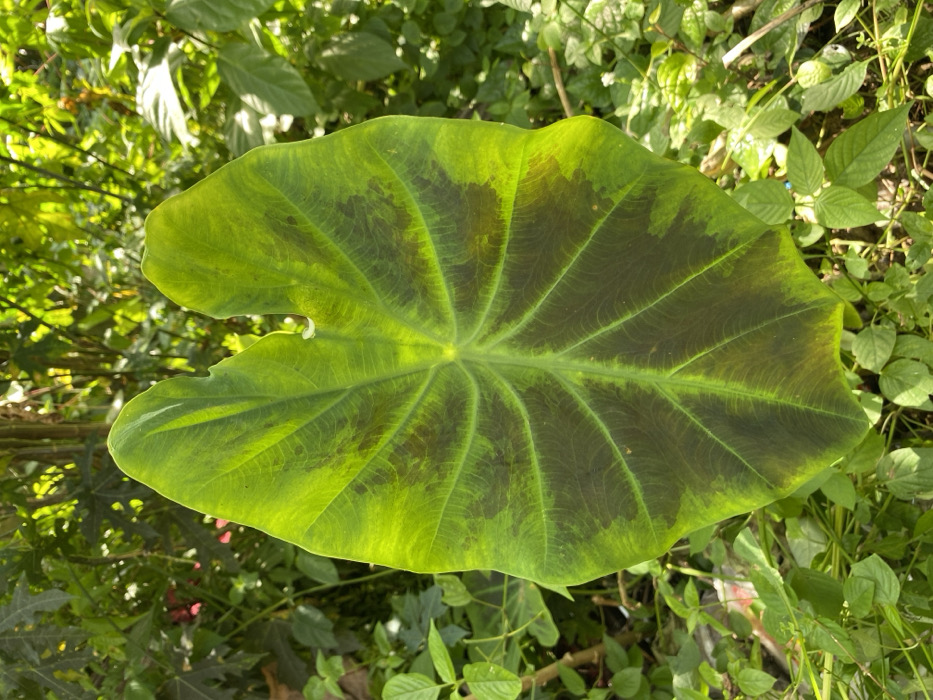 A large, heart-shaped leaf dominates the frame. The leaf exhibits a striking color gradient, transitioning from vibrant green around the edges to a deep, mottled brown towards the center. Prominent veins radiate outward from the center, enhancing the leaf's texture. The leaf is surrounded by a dense collection of green foliage, creating a natural, verdant backdrop. The overall impression is of a lush, tropical setting.