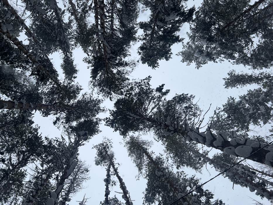- "The image displays a low-angle, upward perspective into a dense coniferous forest in Votkinsk, Russia, during winter" by FM-A5lOj2, licensed under CC BY 4.0