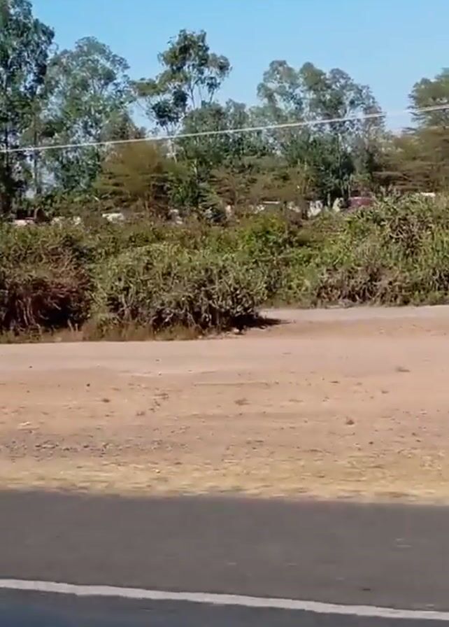 view from a moving vehicle on a paved road. A wide dirt area borders the road, separating it from a dense line of trees and bushes. Power lines are visible strung between some of the trees. The sky is a clear blue. There are no people or other vehicles immediately visible. The video appears to have been shot in daylight.