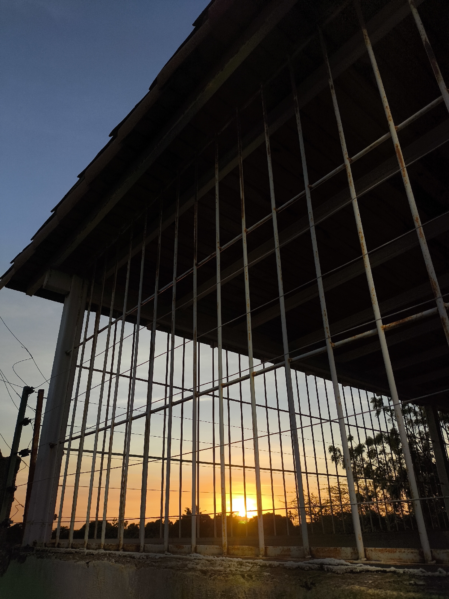 The image depicts a sunset scene in La Guardia, Venezuela, observed through a heavily gridded structure. The upper half of the frame is dominated by the dark, sloped underside of a roof or awning, extending from the upper left corner downwards to the right. Below this, a dense metal grille, consisting of numerous vertical and fewer horizontal bars, occupies the midground. These bars are light grey to white with prominent patches of orange-brown rust. To the far left, a thick, vertical concrete or painted metal pillar supports the overhead structure, with multiple strands of wire, some appearing rusted, attached to its left side. A rough concrete or masonry base is visible directly beneath the grille in the foreground, displaying irregular white markings. Through the bars, the background reveals a vibrant sunset. The sun, a bright yellow-orange orb, is partially visible and positioned slightly left of the vertical center, near the horizon. The sky transitions from a deep blue at the top left to a light blue-grey, then to a vivid orange and yellow around the setting sun. Silhouetted against this bright sky are dark forms of dense foliage and trees, including some appearing tall and slender, lining the horizon. No individuals or animals are present. The scene is illuminated by natural light from the setting sun, casting the foreground structures into shadow and highlighting their textures and deterioration.