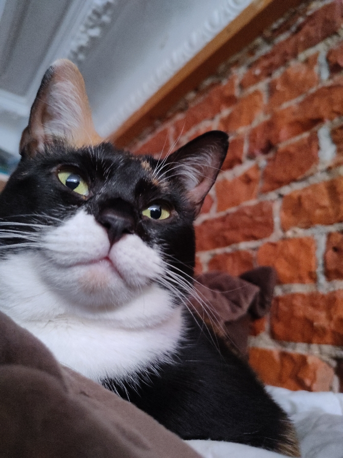 - "A domestic cat, predominantly black and white with subtle tan markings near its ears, is depicted in a close-up, upward-angled shot" by FM-VsDZG2, licensed under CC BY 4.0