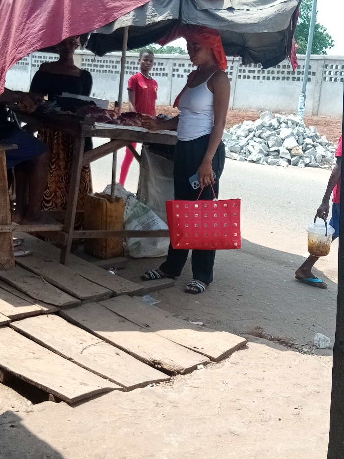 An outdoor scene depicts a makeshift roadside stall in the city of Unknown, Unknown, under bright daylight. Four individuals are present. A wooden stall, covered by a dark tarp and a pink fabric drape, occupies the left side of the frame. Various cuts of red meat are displayed on its surface. Under the stall, a yellow jerry can and a white sack are visible. Wooden planks cover the unpaved ground directly in front of and beneath the stall. To the left of the stall, an adult female is partially visible, wearing a dark off-shoulder top and a patterned skirt, positioned behind the stall as if attending to the merchandise. In the center, an adult female stands facing left, looking towards the stall. She wears a white tank top, dark pants, and black-and-white striped slide sandals. Her head is covered with a red fabric. She holds a red rectangular tote bag with square perforations in her left hand and a smartphone with a light blue case in her right hand. Behind the stall, a young individual in a red t-shirt and red pants stands, looking towards the left. To the far right, only the lower right leg and foot of a fourth individual are visible. This person wears a blue flip-flop and carries a clear plastic container containing a yellow/brown substance with a white lid, held by a white handle. Beyond the stall and the individuals, a narrow asphalt road is present. On the far side of the road, a low concrete wall with square openings spans horizontally. Behind the wall, green foliage is visible, and a utility pole stands on the right. A large pile of grey, angular construction rocks is situated on the unpaved roadside to the right of the stall.
