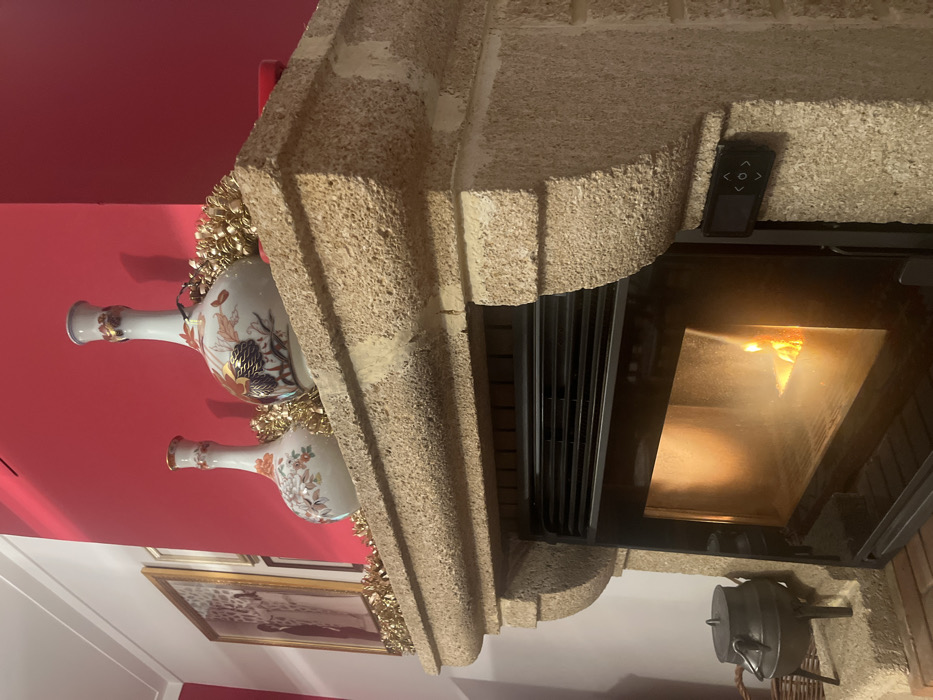 A tan stone fireplace with a fire burning inside is decorated with two vases and gold tinsel. The fireplace is on a red wall above framed artwork. A black control panel is attached to the stone. A metal pot with a lid is on a stand at the bottom right of the fireplace.