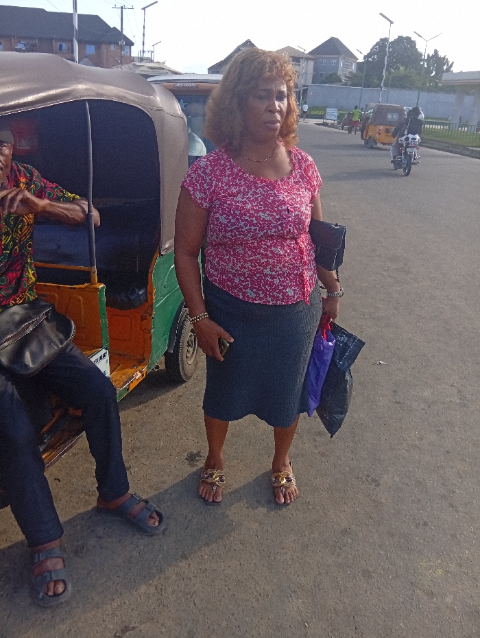 The image depicts an outdoor urban scene in Aba, Nigeria, featuring two individuals and several vehicles on a paved road under bright daylight. In the foreground, a middle-aged woman with light brown, curly hair stands on the asphalt road, facing slightly to the right of the frame, with her gaze directed forward. She wears a pink and white floral patterned short-sleeve top, a dark grey knee-length skirt, and gold-colored flat sandals. She has a gold necklace and bracelets on both wrists. In her left hand, she holds a black clutch bag and two plastic shopping bags (one purple, one black). Her right hand holds a smartphone. To her left, partially visible, a man is seated inside or on a tricycle (known as a Keke Napep). He wears a multi-colored patterned long-sleeve shirt (red, black, yellow, green), dark blue trousers, and grey slip-on sandals. His left arm rests near the opening of the tricycle, which has a beige/tan canopy and a green body. In the background, the paved road extends, with another yellow-canopied tricycle and a motorcycle with a rider visible further down. The environment includes various buildings, some with light-colored walls and dark roofs, utility poles, streetlights, and some sparse trees and foliage. The sun casts moderate shadows, indicating mid-morning or late afternoon.