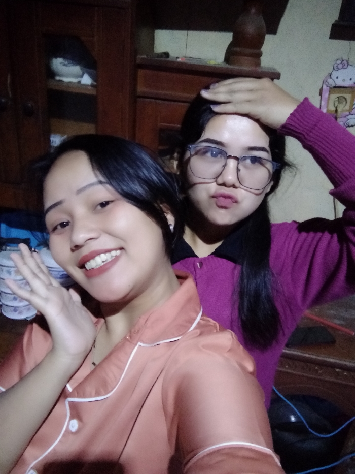The image displays two young adult females indoors in Unknown, Unknown. The background features dark wooden furniture, including a cabinet with shelves visible on the left side, and a light-colored, Hello Kitty-themed decoration on the right. In the foreground, a female with dark hair is positioned on the left, wearing a peach-colored, collared top with white piping. She smiles broadly, revealing teeth, and her right hand is raised near her cheek with fingers slightly spread. Behind and to her right, a second female with dark hair and clear-framed eyeglasses is visible. She wears a dark purple long-sleeved top with a black collar, exhibits a pursed-lip expression, and her right hand is placed on her forehead. Both individuals are looking directly towards the camera. The scene is dimly lit, suggesting an interior setting with artificial light.