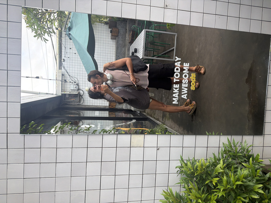 A vertical rectangular mirror shows the reflection of a couple. They are embracing and about to kiss. The woman holds a phone. Behind them is a patio with green chairs and tables, surrounded by greenery and a white-tiled building. The mirror has the words "MAKE TODAY AWESOME SODA" on the bottom right. The mirror is mounted on a white-tiled wall next to a green shrub.
