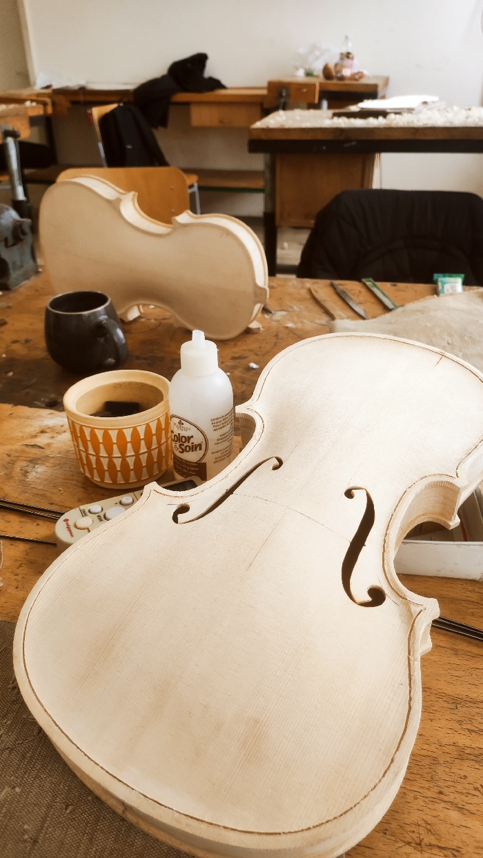 The scene depicts a lutherie workshop or classroom located in Kazanlak, Bulgaria. The primary subject in the foreground is an unvarnished, light-colored wooden instrument body, consistent with a violin or viola, positioned face-up on a wooden workbench. It features precisely carved F-holes and an incised channel for purfling along its perimeter. Adjacent to the instrument are a white plastic squeeze bottle labeled "Color & Soin," a cylindrical wooden container with an orange and white geometric pattern and a dark object inside, a black ceramic mug, and a partial view of a small white digital device with red buttons. In the midground, another similar unvarnished wooden instrument body rests on its side behind the foreground instrument. The wooden workbench surface exhibits visible wear and is scattered with fine wood shavings and several metal hand tools, resembling chisels or scrapers. A dark metal vice is secured to the left edge of this workbench. The background reveals additional wooden workbenches, suggesting a multi-station environment. A dark jacket or piece of clothing is draped over a chair or workbench in the upper left. The room features light-colored walls. No individuals are visible. The arrangement of tools and unfinished instruments indicates ongoing or recently suspended instrument crafting activities.