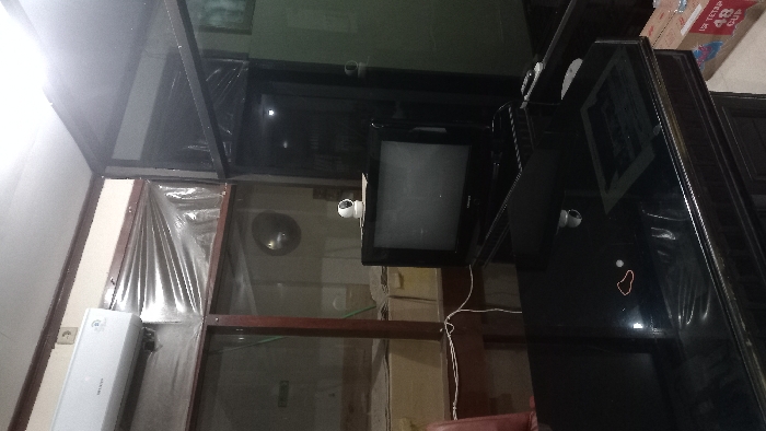 The image depicts an indoor commercial or office environment, specifically in Surabaya, Indonesia. In the foreground, a large, dark, glossy rectangular desk or counter occupies the lower half of the frame. A black CRT television is centrally positioned on this surface, with a small white, dome-shaped IP camera mounted on its top. To the right of the television, a white remote control or similar device is visible. Further left on the desk, a red rubber band and a small white circular object are present. A reflection of an overhead light source is visible on the desk's surface. The upper-left corner of a red chair is partially visible on the far left. In the midground, a wooden-framed partition with multiple glass panels separates the foreground from a background area. The upper sections of these glass panels are covered with clear, crinkled plastic sheeting. A white Sharp air conditioner unit is mounted on the wall above the partition, with an electrical outlet visible to its right. A white, tangled electrical cable runs horizontally along the lower section of the partition. Through the clear panels of the partition, several light-brown cardboard boxes are stacked in the background. A circular, reflective object, possibly a clock or decorative item, is mounted on the far wall behind the partition. To the right of the main desk, a brown cardboard box labeled with Indonesian text, "ISI TETAP 48 CUP" (Contents remain 48 cups), is positioned on the floor. No individuals are present in the scene.