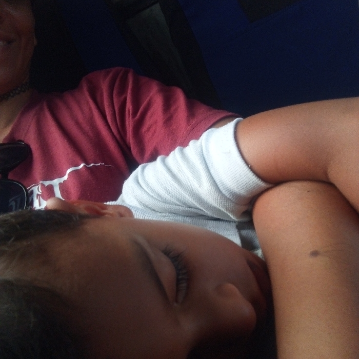 A child with closed eyes is resting, leaning on an adult wearing a red shirt