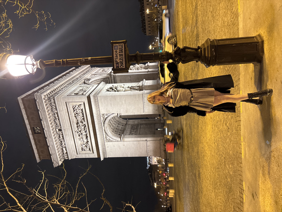 The image depicts an illuminated nighttime scene at Place Charles de Gaulle, Paris, France. In the foreground, slightly right of center, a person with long, light-colored hair and glasses stands facing the camera. They wear a light-colored sleeveless top with a collar and black trim, a matching pleated mini-skirt, a thin black belt, and black lace-up combat boots. A long, dark coat with fur trim is draped over their shoulders, and a pearl necklace is visible. Their left hand rests on a dark, ornate lamppost bearing a street sign that reads "Place Charles de Gaulle." The lamppost is brightly lit at its top. Dominating the background is the Arc de Triomphe, a large stone triumphal arch, brightly illuminated from below against a dark sky, showcasing its detailed sculptural reliefs and architectural elements. The ground is paved with light-colored cobblestones or blocks, cast in a warm, yellowish-orange glow from the streetlights. To the left, a blurred figure on a scooter or motorcycle with a red delivery box is visible in motion. To the right, behind the person, several blurred vehicles, including a light-colored car, are in motion on the street. Bare tree branches are visible in the upper left corner and behind the lamppost. Distant city lights and building outlines are faintly visible in the far background.