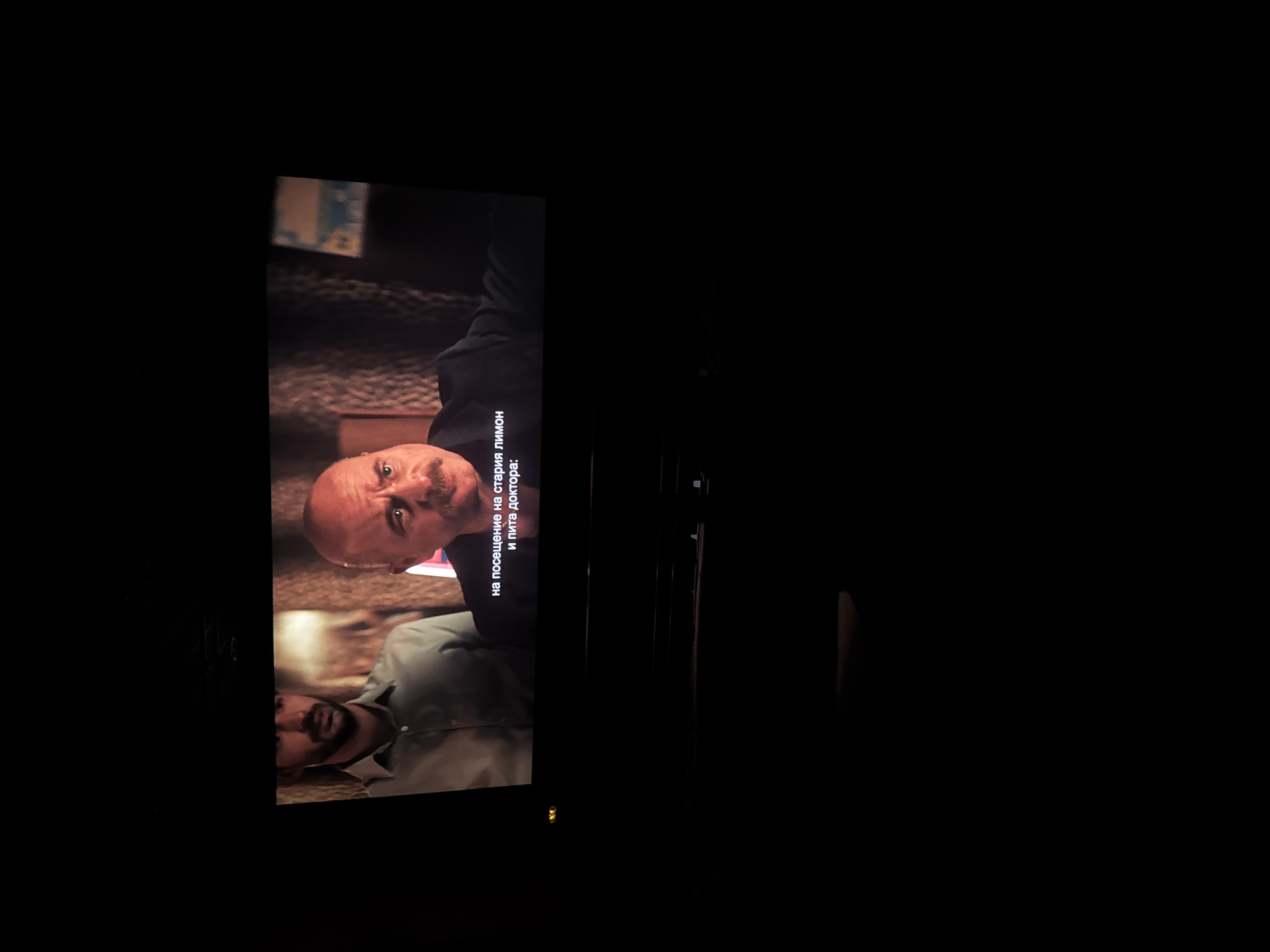 Two men are visible. One is lying on the floor wearing a light-colored shirt, facing upwards with a beard. Another man, bald, is standing over him, peering down with a slightly furrowed brow and a mustache. Subtitles in a Cyrillic language appear to the right of their faces. They are in an dimly lit room.