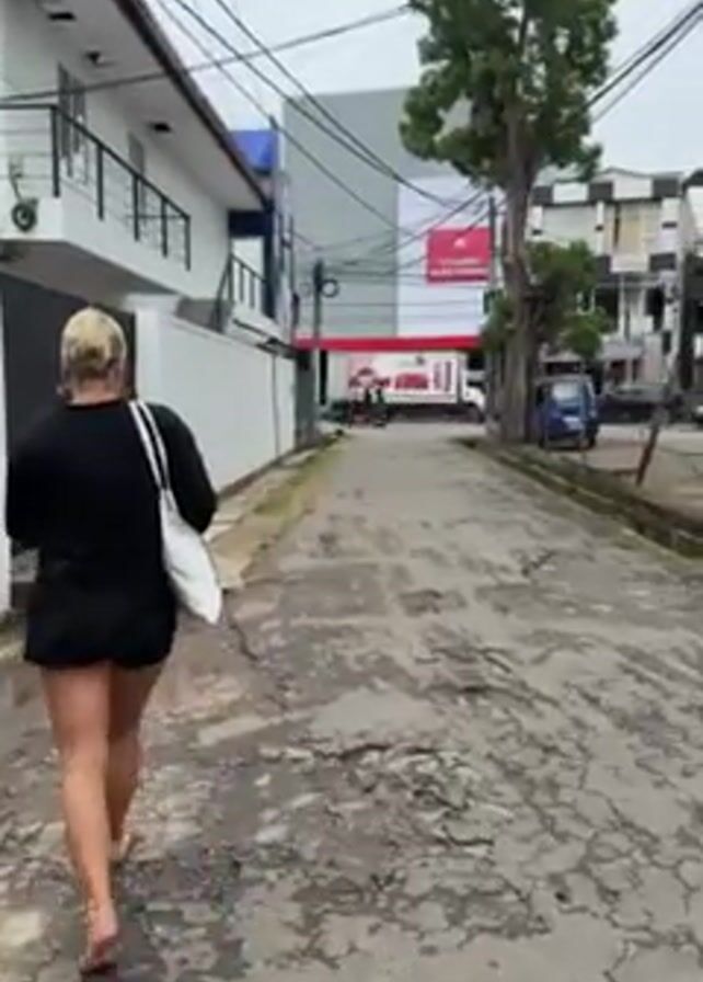 A woman with blonde hair is walking away from the camera down a potholed road. She is wearing a black jacket, shorts, and sandals, and carrying a white tote bag. On the left is a white building and on the right is a tree. Above, there is a tangle of power lines. A motorcycle passes her on the road. Further down the road there is a truck with a red and white sign. The scene is overcast.