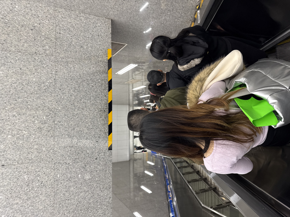 The image depicts a crowded escalator descending into a subway or public transit station in Fengtai District, China. The viewpoint is from behind a female individual with long, brown ombre hair, wearing a light purple top. This individual carries a reflective silver quilted bag and a bright neon green bag, with a beige fur-lined hood draped over her arm or bag. Directly in front, a line of approximately six to eight individuals, mostly observed from behind, occupies the escalator steps. Their faces are not visible. Most are dressed in dark, casual winter clothing. One male subject has a short, dark haircut, and another person further down wears a black baseball cap. No direct interactions or specific actions beyond standing on the moving escalator are discernible. The escalator features black steps and metallic handrails. The tunnel walls are clad in light grey, speckled material, likely granite or a similar stone. A yellow and black striped warning or clearance marking is horizontally positioned across the upper tunnel section. Rectangular light fixtures are visible along the walls, providing illumination. The scene conveys urban transit movement during potentially busy hours.