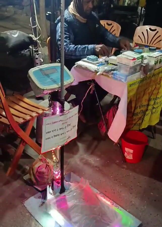 The scene unfolds at an outdoor marketplace, illuminated by artificial lighting. At the center, a man with a scarf around his head sits behind a table covered with various items, possibly merchandise for sale, and what appears to be a digital scale. He is handling currency. A sign in Bengali is attached to a tall pole that features a platform with flashing colored lights at the base. A red bucket is placed nearby. There are also two wooden chairs next to him. Pedestrians pass through the background. The environment suggests a bustling commercial area, particularly at night.