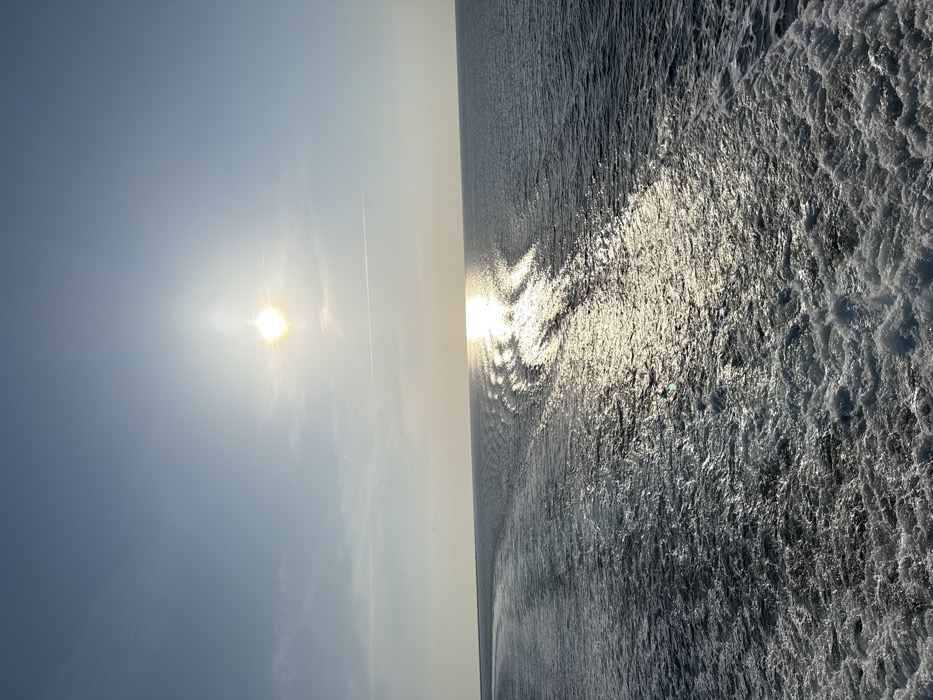 The image depicts a maritime scene, observed from the stern of a moving vessel, showing its wake on the open sea near Kamariotissa, Greece. The bright, undiffused sun is positioned in the upper center-right quadrant of a clear, light blue sky, casting an intense, shimmering reflection across the water surface, extending from the horizon towards the foreground. A distinct, foamy white wake trails from the bottom right corner, curving towards the left mid-ground, indicating the vessel's propulsion through the dark blue-gray water. Faint cirrus clouds are visible, and a single, thin contrail traverses the sky horizontally in the upper mid-section. No individuals, other vessels, or landmasses are visible in the frame.