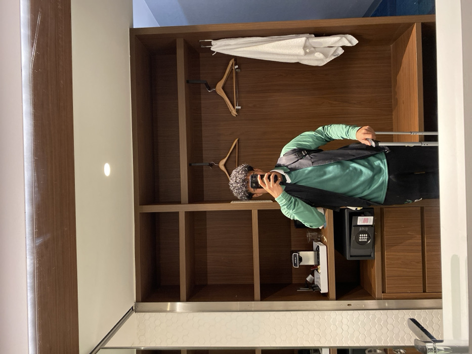 The image is a mirror selfie taken indoors, appearing to be within a modern hotel room or similar accommodation