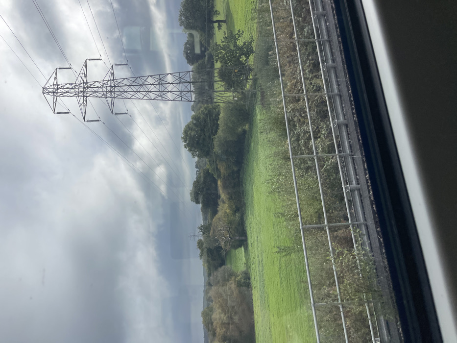 The image captures a rural landscape observed from a train window, looking towards the east, within the city of Reigate and Banstead, United Kingdom, specifically along the Brighton Main Line between Redhill and Earlswood stations, in the vicinity of Salfords. The foreground is dominated by the lower section of a train window frame, with a horizontal grey metal barrier or fence immediately visible outside, consistent with railway infrastructure. Below this barrier, a dark strip indicates the ground adjacent to the railway track, sparsely covered with vegetation. The midground features a band of dense, wild vegetation, primarily green bushes and smaller plants, transitioning into a large, expansive green field. In the right-center of this field, a prominent steel lattice-work electricity pylon stands tall, supporting multiple overhead power lines that extend across the upper right portion of the frame. A smaller, dead or barren tree with gnarled branches is visible among the vegetation to the left of the pylon. The background consists of a line of deciduous trees and woodland, exhibiting a mix of green and autumnal brown foliage, forming a distant tree line. The sky is heavily overcast with uniform grey clouds, indicating a cloudy daytime environment. No individuals, animals, or explicit actions are present in the scene.